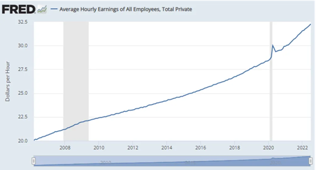 但如果从数据来看的话,美国平均时薪每上涨2.5美元所花的时间越来越短,也就意味着工资上涨的速度越来越快,幅度越来越大。