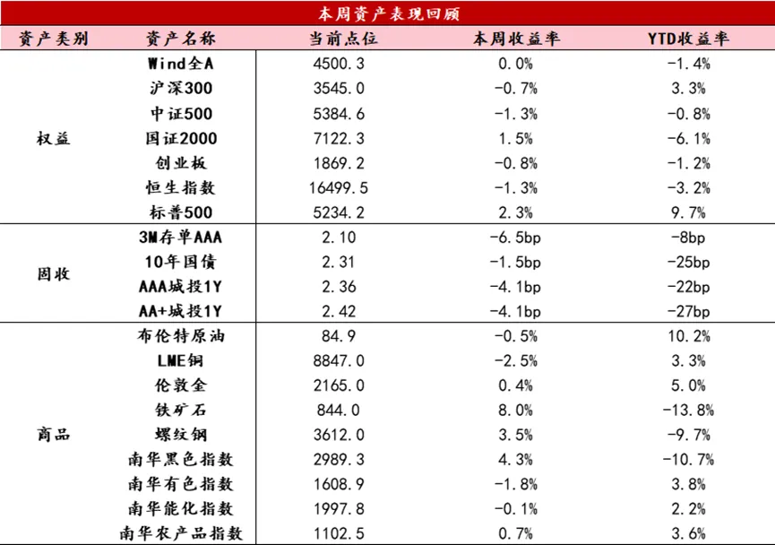 【股票】本周市场延续震荡格局,宽基指数表现分化,以中证1000、国证2000为代表的小盘股表现靠前、均有收涨,上证50、沪深300、中证500等大中盘指数下跌。本周市场情绪热度仍处于高位,全周日均成交额延续万亿以上规模,融资余额延续回升,北向资金转为小幅净流出。受人民币汇率贬值带动,周五市场盘中下跌,大资金再度通过上证50、沪深300ETF入市,考虑到近期美元指数走强、俄罗斯发生恐怖袭击等外部因素扰动,关注短期资金流向的边际变化。