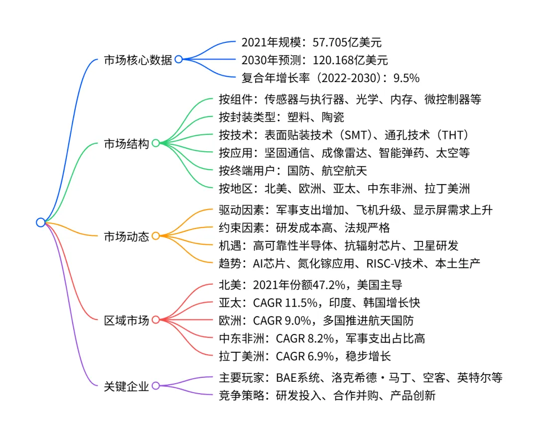 全球军事和航空航天半导体市场在 2021 年估值为57.705 亿美元,预计 2030 年将达120.168 亿美元,2022-2030 年复合年增长率为9.5%;北美是 2021 年市场份额最大的地区(47.2%),亚太地区预计将以11.5% 的最高复合年增长率增长;市场增长主要受军事支出增加、飞机升级现代化计划推进、对更轻便先进显示屏需求上升等因素驱动,同时面临研发成本高、政府法规严格等约束,而高可靠性半导体发展、抗辐射芯片创新、卫星发射任务相关研发增多则带来重要机遇,核心应用涵盖坚固通信、成像雷达、智能弹药等领域,关键企业包括 BAE 系统、洛克希德・马丁等。