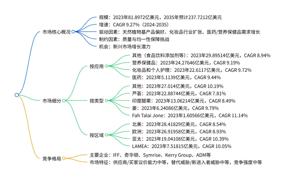 2023 年全球草本提取物市场规模达 81.8972 亿美元,预计 2035 年将增至 237.7212 亿美元,CAGR 为 9.27%;市场受天然植物基产品偏好提升、化妆品和个人护理行业扩张、医药及营养保健品领域需求增长驱动,同时面临提取物质量与均一性保障的挑战,亚太地区为增速最快区域(CAGR 10.39%),应用上 “其他” 领域(食品饮料添加剂、动物饲料等)当前占比最高,化妆品和个人护理领域增速最快(CAGR 9.72%),类型上 Fah Talai Jone 提取物增速领先(CAGR 11.14%),主要参与者包括国际香精香料(IFF)、奇华顿(Givaudan)等企业。