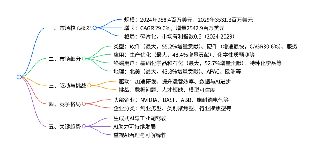2024-2029 年全球化工 AI 市场将实现高速增长,2024 年市场规模为 98840 万美元,2029 年预计达 353130 万美元,CAGR 达 29.0%,增量增长 254290 万美元;市场呈碎片化竞争格局,受加速研发、提升运营效率与可持续性、数据激增及 AI 算法进步驱动,同时面临数据问题、跨学科人才短缺、模型可信度等挑战;软件是最大细分类型(2024 年占比 56.7%),生产优化是核心应用(贡献 48.4% 增量增长),基础化学品和石化行业是主要终端用户(占比超 50%),北美为最大区域市场(2029 年占比 43.3%),头部企业包括 NVIDIA、BASF、ABB 等。