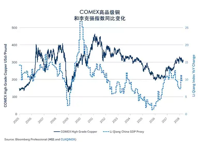 用于计量中国GDP增长的另一个替代和更狭义的指标是李克强指数,该指数主要计量银行已发放贷款、耗电量和铁路运货量的变化,显示中国经济增速从2011年的20%下降至2015年的2.5%左右,然后在去年反弹至12%左右。即使以中国国家总理李克强命名的这个指数没有包括中国的服务业表现,它也可以相当准确地反映中国工业部门的加速和减速期,这与铜和其它原材料的价格具有密切的关联性(图2)。