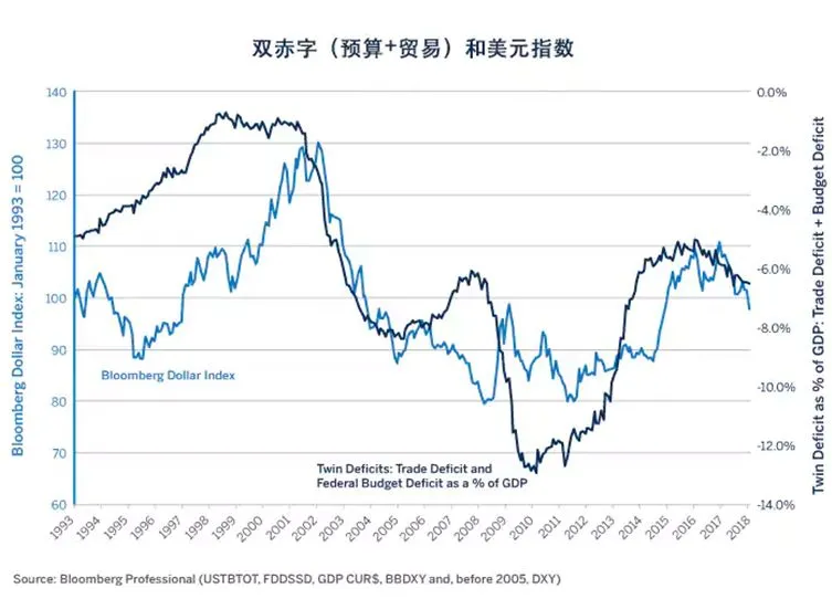 图8:除2009年危机外,“双赤字”上涨通常意味着美元下跌。