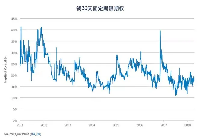 或许是反映对中国和全球增长将不足以吸收铜的大量供应的风险,期权波动性是向下倾斜的——尤其是对于较长期的期权而言(图10)。按照历史标准来看,铜期权的整体成本并不是特别高。最近几周平价(ATM)期权的交易大约在17%,与历史低点的接近程度大大超过历史高点(图11)。如果铜期权遵循我们在股市和债市看到的相同波动模式,那么到2020年代初期,美联储政策收紧和更加平坦的收益率曲线可能最终转化成铜的波动性(包括实际波动性和隐含波动性)大幅上升。回顾2011和2012年,铜期权交易的隐含波动性大约为25-40%。倘若美联储的政策紧缩导致另外一次经济危机,这些水平的波动性可能在某一天成为最新的新常态。