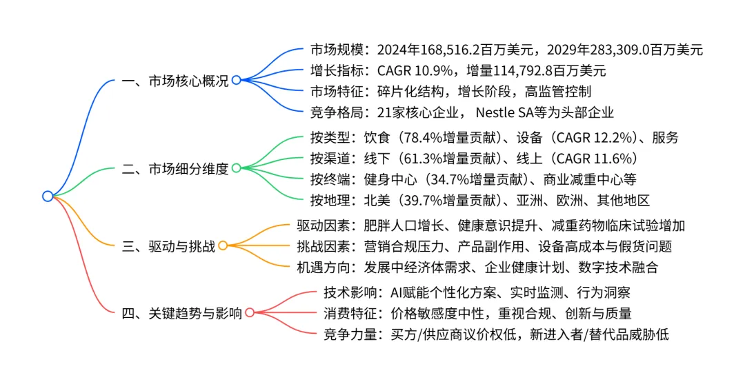 2024-2029 年,全球体重管理市场将以10.9% 的 CAGR加速增长,从 2024 年的168,516.2 百万美元增至 2029 年的283,309.0 百万美元,增量达114,792.8 百万美元;市场呈碎片化结构,北美是最大且增长最快的区域(CAGR 11.7%),饮食类产品占比最高(2024 年 79.3%)且贡献 78.4% 增量增长,设备类(CAGR 12.2%)和线上渠道(CAGR 11.6%)是增速领先的细分领域,健身中心和健康俱乐部为核心终端用户,市场驱动因素包括肥胖人口增长与健康意识提升,同时面临营销挑战、产品副作用及设备高成本等问题,AI 技术正推动市场向个性化、数据化转型。