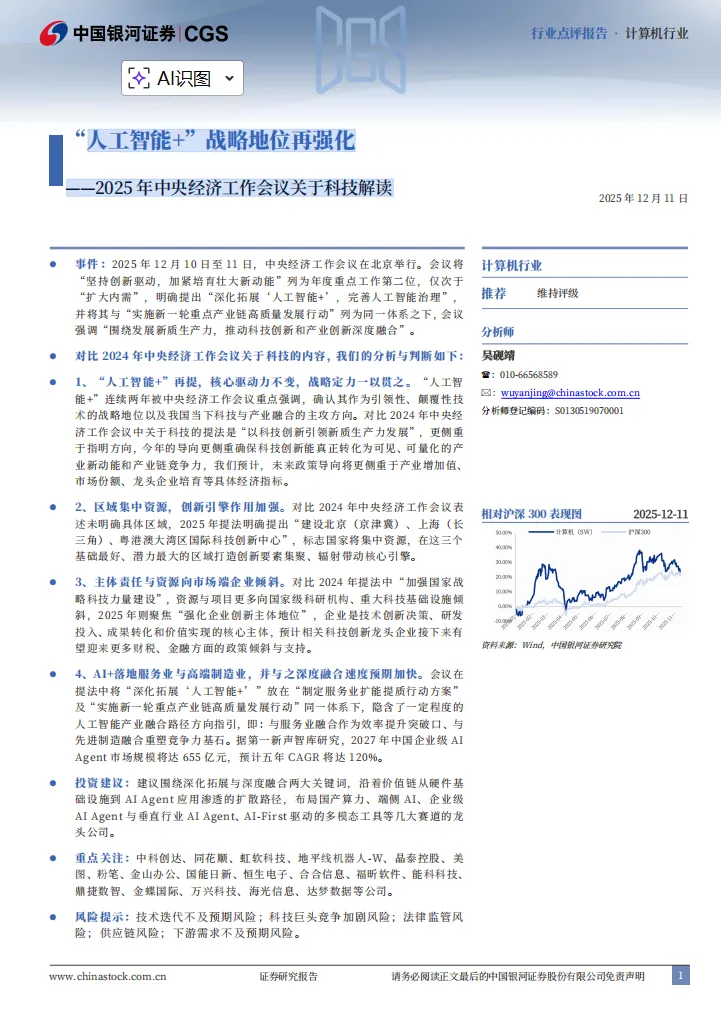 该报告核心围绕 2025 年中央经济工作会议中 “人工智能 +” 战略的强化展开,凸显 AI 技术(尤其是 AI Agent)在产业转型中的核心作用,结合市场数据与评级体系,清晰传递了政策导向下的产业机遇与投资方向,为市场参与者提供了兼具政策解读与实操参考的价值信息。