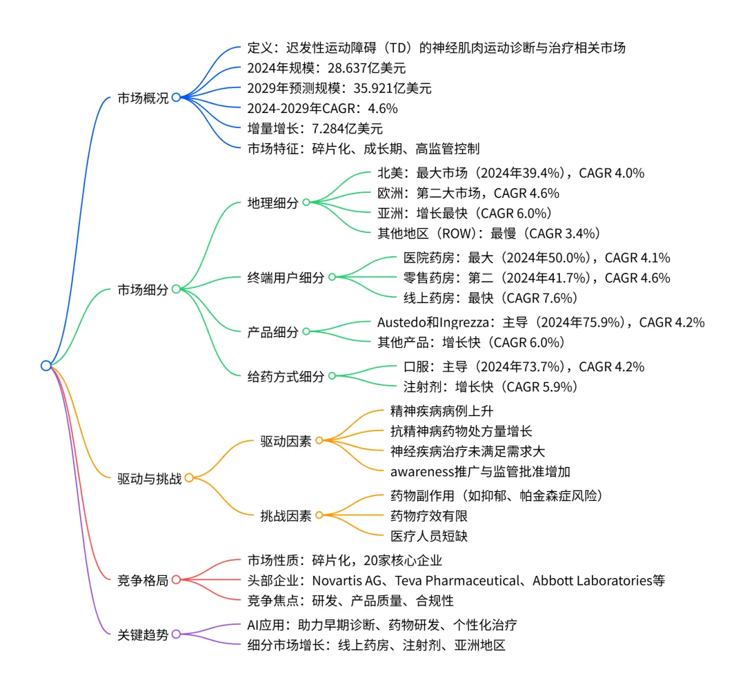 全球迟发性运动障碍治疗市场在 2024 年规模达 28.637 亿美元,2024-2029 年将以 4.6% 的 CAGR 增长至 35.921 亿美元,增量增长 7.284 亿美元;市场呈碎片化竞争格局,北美为最大市场(2024 年占比 39.4%),亚洲是增长最快区域(CAGR 6.0%);产品端Austedo 和 Ingrezza占主导(2024 年占比 75.9%),给药方式以口服为主(2024 年占比 73.7%),终端以医院药房为核心(2024 年占比 50.0%);驱动因素包括精神疾病病例增加、抗精神病药物处方量增长,挑战主要是药物副作用和疗效问题,AI 技术在诊断和药物研发中逐渐发挥重要作用。