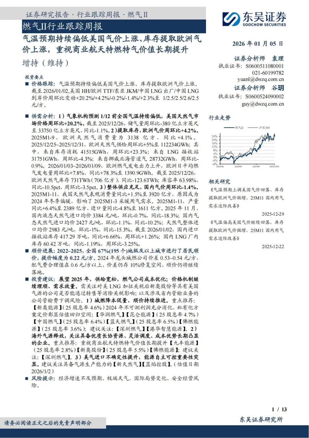 『研报』燃气Ⅱ行业跟踪周报:气温预期持续偏低美国气价上涨、库存提取欧洲气价上涨,重视商业航天特燃特气价值长期提升