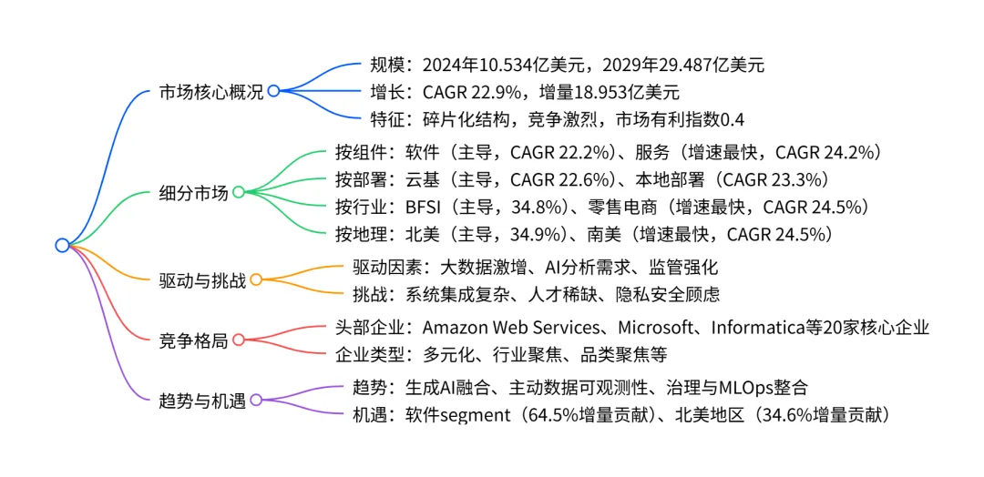 2024-2029 年全球 AI 数据质量市场呈现强劲增长态势,2024 年市场规模达 10.534 亿美元,预计 2029 年将增至 29.487 亿美元,CAGR 为 22.9%,增量增长 18.953 亿美元;市场结构呈碎片化,竞争激烈,软件 segment(占比 67.4%)和云部署模式(占比 65.2%) 为 2024 年主要细分领域,BFSI 行业是最大应用场景,北美地区贡献 34.6% 的增量增长;驱动因素包括大数据激增、AI 分析战略需求及监管强化,同时面临系统集成复杂、专业人才稀缺等挑战,头部企业涵盖 Amazon Web Services、Microsoft、Informatica 等。