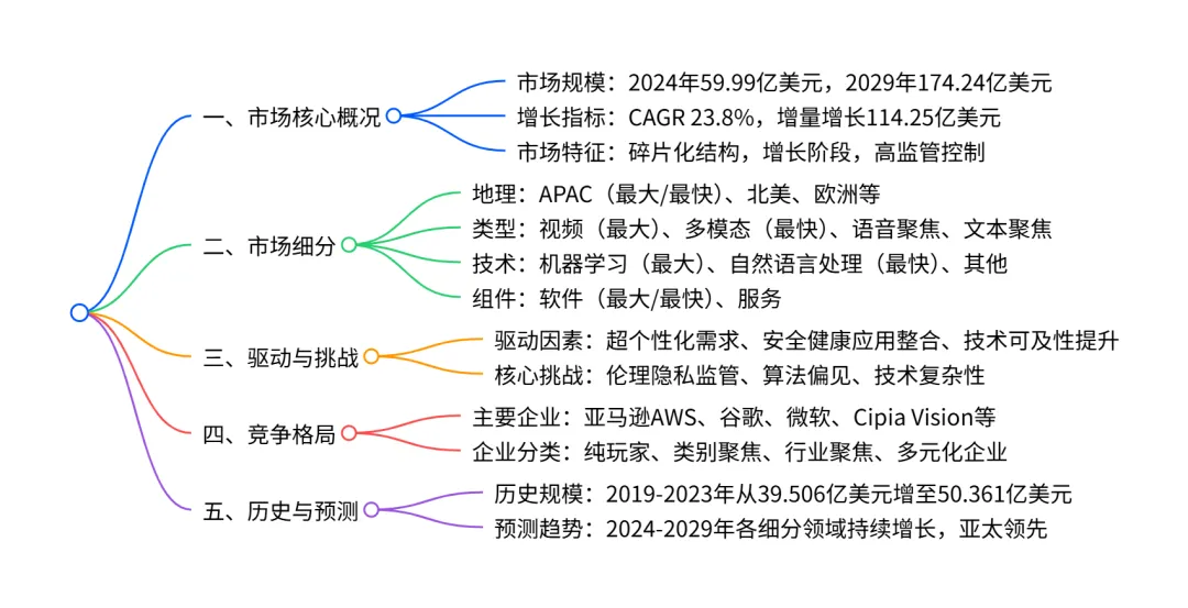 2024-2029 年全球情感 AI 市场呈现高速增长态势,2024 年市场规模达 59.99 亿美元,预计 2029 年将增至 174.24 亿美元,CAGR 为 23.8%,增量增长 114.25 亿美元;市场结构呈碎片化,APAC是最大且增长最快的地理区域,视频是最大的类型细分市场,机器学习是核心技术支撑,软件是主要组件;驱动因素包括超个性化需求、安全领域整合、技术进步,同时面临伦理隐私监管、算法偏见、技术复杂性等挑战,竞争格局涵盖亚马逊、谷歌等科技巨头及专业初创企业。