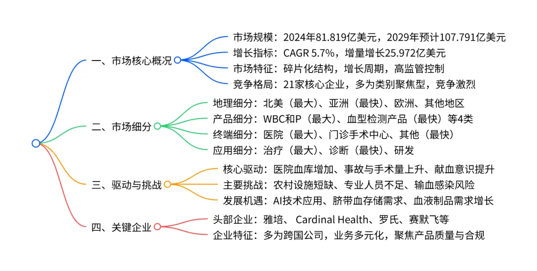 2024-2029 年全球血液市场呈现加速增长态势,2024 年市场规模达 81.819 亿美元,预计 2029 年将增至 107.791 亿美元,CAGR 为 5.7%,增量增长 25.972 亿美元;市场呈碎片化竞争格局,北美为最大区域市场(2024 年占比 41%),亚洲为增长最快区域(CAGR 6.2%);产品端WBC 和 P(全血采集与处理) 是最大细分市场(2024 年占比 65%),血型检测产品增长最快(CAGR 6.2%);终端以医院为主(2024 年占比 55.7%),应用端治疗领域占比最高(2024 年占比 62.3%),诊断领域增长最快(CAGR 7.0%);驱动因素包括医院与血库数量增加、道路事故及手术量上升,挑战主要是农村地区设施与专业人员短缺,AI 技术正推动行业效率与安全性提升。