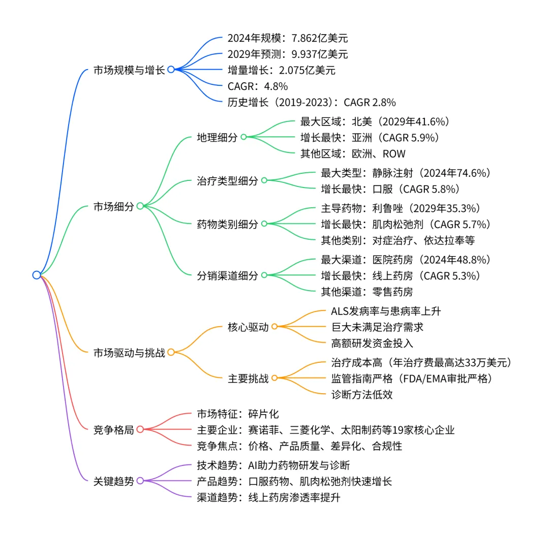 2024-2029 年全球肌萎缩侧索硬化症(ALS)治疗市场将以4.8% 的 CAGR增长,从 2024 年的7.862 亿美元增至 2029 年的9.937 亿美元,增量增长2.075 亿美元;市场呈碎片化竞争格局,北美是最大市场(2029 年占比 41.6%)且贡献 47.3% 增量增长,亚洲为增长最快区域(CAGR 5.9%);治疗类型中静脉注射占比最高(2024 年 74.6%),口服增速最快(CAGR 5.8%);药物类别以利鲁唑为主导(2029 年占比 35.3%),肌肉松弛剂增速领先(CAGR 5.7%);分销渠道中医院药房占比最大(2024 年 48.8%),线上药房增速最快(CAGR 5.3%);市场增长受 ALS 发病率上升、未满足医疗需求及研发资金投入驱动,但面临治疗成本高、监管严格等挑战。