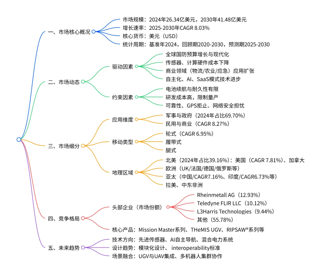 全球无人地面车辆(UGV)市场在 2024 年规模达 26.34 亿美元,预计 2030 年将增长至 41.48 亿美元,2025-2030 年复合年增长率为 8.03%;市场以北美为最大区域市场(2024 年占比 39.16%) ,军事与政府应用为最大细分领域(2024 年占比 69.70%) ,核心驱动力包括全球国防预算增长、传感器与计算硬件成本下降、商业领域(物流、农业等)快速 adoption 及自主化与 AI 技术进步,同时面临电池续航有限、研发成本高、可靠性与网络安全担忧等约束,头部企业有 Rheinmetall AG(市场份额 12.93%)、Teledyne FLIR LLC 等,未来趋势聚焦先进传感器、AI 自主导航、混合电力系统等技术创新。