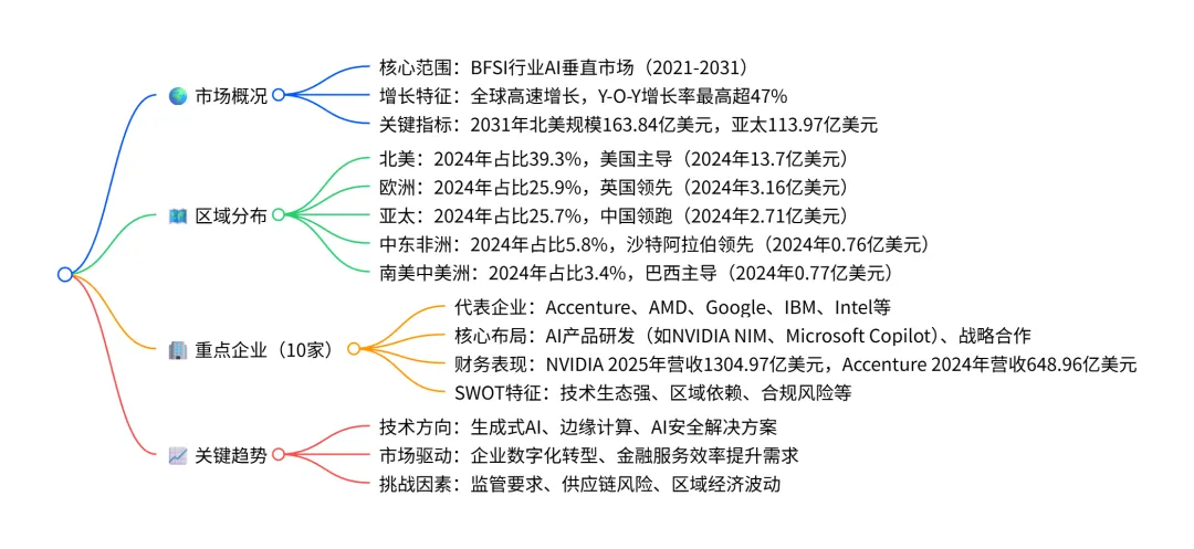 - 核心定义:聚焦 BFSI(银行、金融服务和保险)行业中人工智能技术的应用市场,涵盖全球及五大区域的规模、增长及细分国家表现。