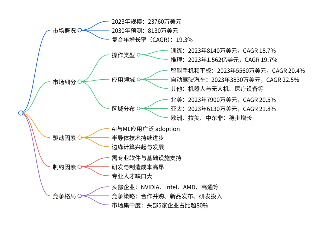 - 答案:区域格局上,北美是 2023 年最大市场(7900 万美元,占比 33.2%),技术与企业资源集中;亚太地区是增长最快区域(CAGR 21.8%),原因包括:中国、日本、韩国等国家大力投资 AI 与自动驾驶技术;智能手机、IoT 设备等终端产品制造业发达,本地需求旺盛;政府推出 AI 相关政策,扶持半导体与 AI 产业研发,吸引大量资金与人才投入。