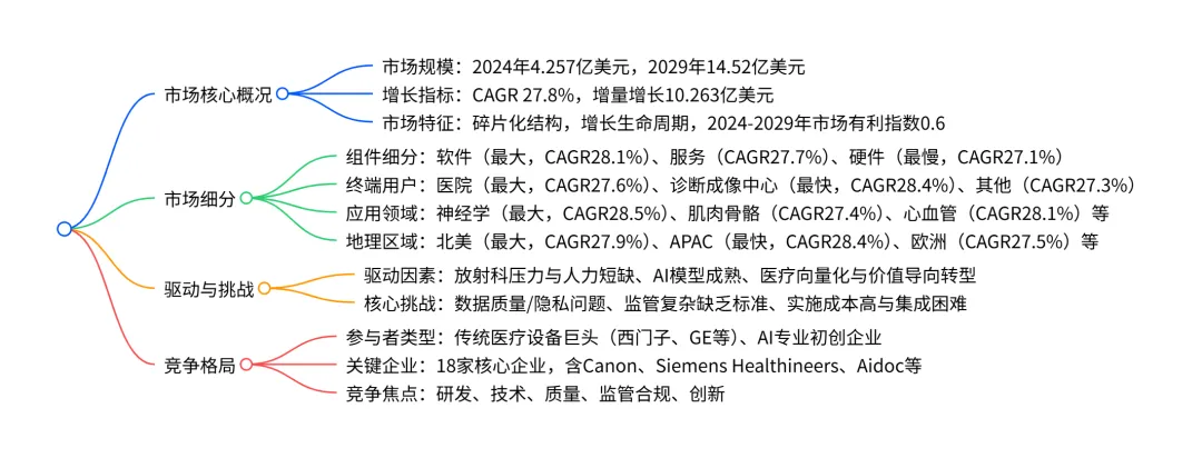 2024-2029 年全球 AI 在 MRI 市场呈现高速增长态势,2024 年市场规模达4.257 亿美元,预计 2029 年将增至14.52 亿美元,期间复合年增长率(CAGR)为27.8%,增量增长达10.263 亿美元;市场结构呈碎片化,处于增长生命周期,软件是最大且增长最快的组件 segment(CAGR 28.1%),医院是核心终端用户(占 2024 年市场份额 57.9%),神经学是主要应用领域(CAGR 28.5%),北美为最大区域市场(贡献 43.3% 增量增长),APAC是增长最快区域(CAGR 28.4%);驱动因素包括放射科压力增大、AI 技术成熟等,核心挑战涉及数据质量、监管复杂及实施成本高,市场竞争由传统医疗设备巨头与 AI 初创企业共同主导。