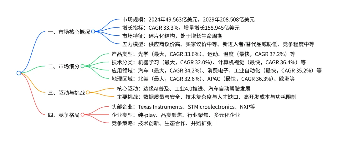 2024-2029 年全球 AI 传感器市场呈高速增长态势,2024 年市场规模达49.563 亿美元,预计 2029 年将增至208.508 亿美元,期间年复合增长率 33.3%,增量增长达158.945 亿美元;市场结构呈碎片化,供应商议价能力高、新进入者威胁低,汽车领域为最大应用板块(2029 年占比 51.4%),光学传感器是最大产品类型,机器学习是核心技术支撑,北美为最大区域市场,APAC增长最快(CAGR 36.3%),同时面临数据安全、技术复杂度及高开发成本等挑战,头部企业通过技术创新与生态合作巩固竞争地位。