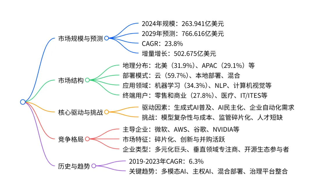 2024-2029 年全球 AI 工具包市场呈现高速增长态势,2024 年市场规模达263.941 亿美元,预计 2029 年将增至766.616 亿美元,CAGR 为23.8%,增量增长达502.675 亿美元;市场以碎片化为特征,北美是最大且增长最快的地理区域,云部署是主导部署模式,机器学习为核心应用领域,零售和商业是最大终端用户群体;驱动因素包括生成式 AI 普及、AI 民主化及企业自动化需求,同时面临模型复杂性、监管碎片化和人才短缺等挑战,竞争格局由微软、AWS、谷歌等科技巨头及开源生态主导。