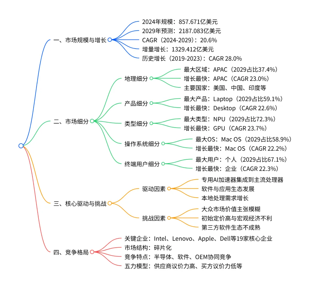 2024-2029 年全球 AI PC 市场呈高速增长态势,2024 年市场规模达857.671亿美元,2029年预计增至2187.083亿美元,CAGR为20.6%,增量增长 1329.412亿美元;市场以APAC为最大且增长最快区域(2029年占比37.4%,CAGR 23.0%),Laptop为核心产品 segment(2029 年占比59.1%,贡献 59.7%增量增长),NPU 为主要类型 segment(2029年占比72.3%,贡献 71.1%增量增长),Mac OS 为领先操作系统(CAGR 22.2%),个人用户为主要终端群体(2029 年占比 67.1%);驱动因素包括专用 AI 加速器集成、软件生态发展及本地处理需求增长,面临价值主张模糊、高定价等挑战,竞争格局呈现半导体厂商、软件平台与 OEM 厂商协同竞争态势。