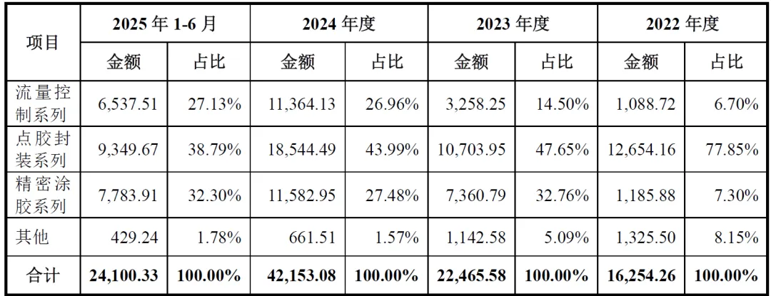 公司已形成流量控制、点胶封装、精密涂胶三大核心产品系列,覆盖从零配件、核心部件到智能整机设备的全链条,可为不同领域客户提供综合一体化解决方案。产品应用领域广泛,涵盖半导体、消费电子、汽车电子、新能源等多个高增长行业,能够抵御单一行业波动风险,市场适应能力强。