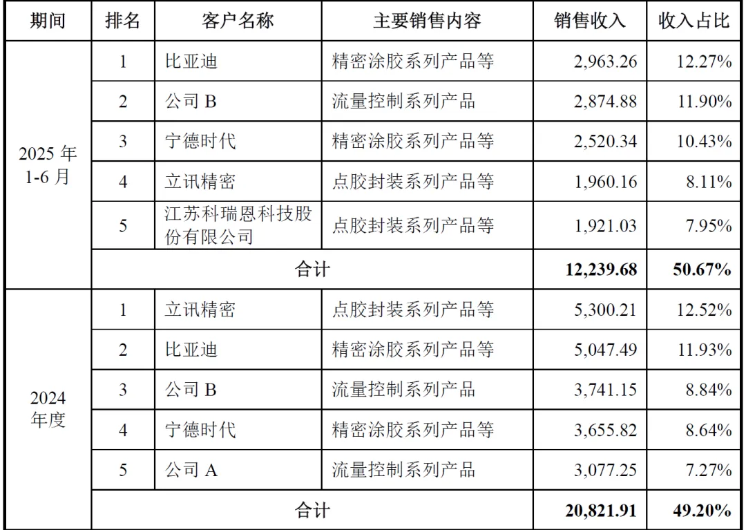 公司前五大客户合计销售收入占比分别为2022年37.98%、2023年44.99%、2024年49.20%、2025年1-6月50.67%,呈小幅上升趋势。