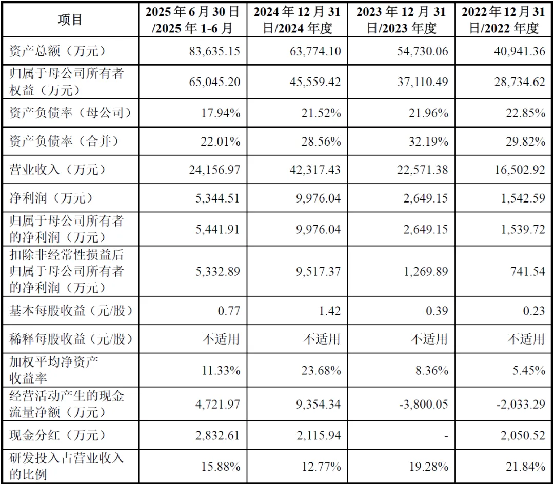 截至2025年6月30日,公司归属于母公司所有者权益为65,045.20万元,较2022年末的28,734.62万元大幅增长,主要系公司盈利积累及增资扩股所致。所有者权益中,股本7,496.30万元、资本公积31,611.71万元、未分配利润22,428.57万元、盈余公积2,722.31万元,权益结构健康,为公司持续发展提供坚实基础。