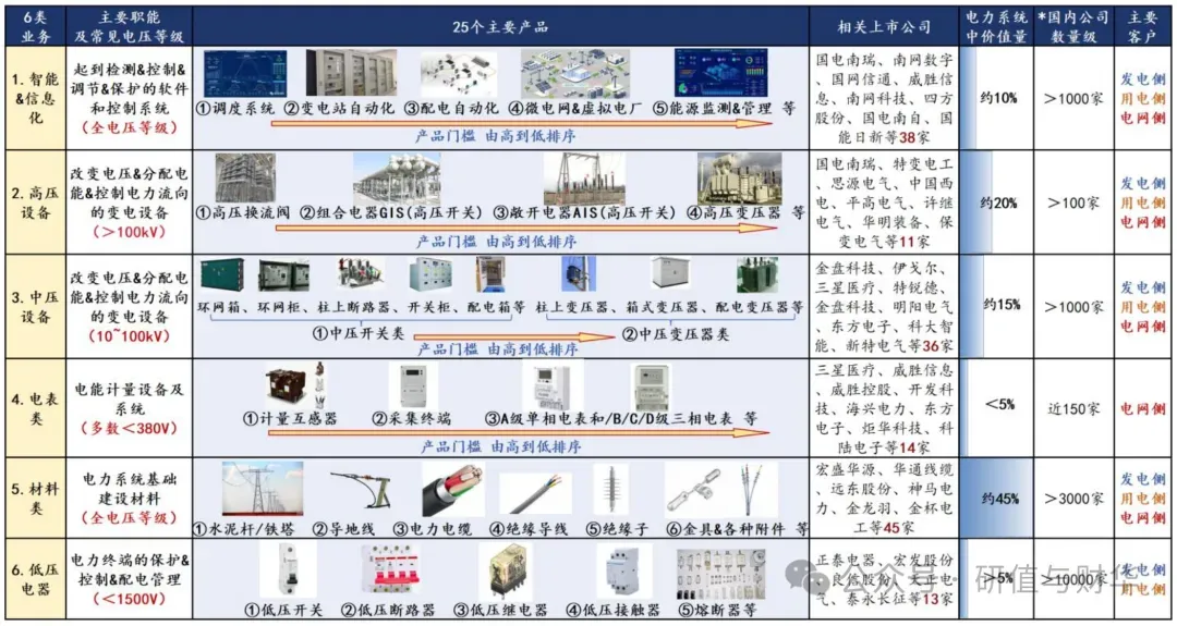 电网设备作为AI电力产业链的核心硬件支撑,按业务属性可分为6大类(① 智能&信息化系;②高压设备、③中低压设备、④电表类、⑤材料类、⑥低压电器。),涵盖28个代表产品。具体梳理如下: