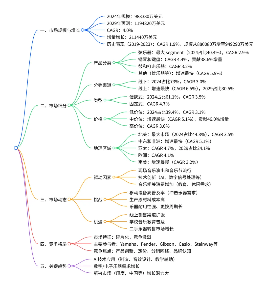 2024-2029 年全球乐器市场呈现加速增长态势,2024 年市场规模达983380 万美元,预计 2029 年增至1194820 万美元,期间复合年增长率为4.0%,增量增长211440 万美元;市场结构呈碎片化,弦乐器为最大产品细分市场,线下为主要分销渠道,便携式乐器占比最高,中低价位产品主导市场,北美是最大区域市场且贡献 39.1% 增量增长,中东和非洲增速最快(CAGR 5.1%);驱动因素包括现场音乐演出流行、技术创新及音乐相关消费增加,面临移动设备普及、生产成本高企等挑战,AI 技术应用和线上销售扩张成为重要增长机遇,市场竞争激烈, Yamaha、Fender、Gibson 等为主要参与者。