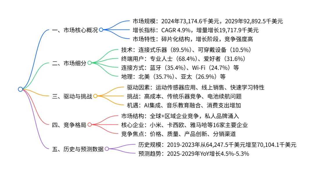 2024-2029 年全球智能乐器市场将以4.9% 的 CAGR加速增长,从 2024 年的73,174.6 千美元增至 2029 年的92,892.5 千美元,增量增长达19,717.9 千美元;市场呈碎片化结构,北美是最大且增长最快的区域(CAGR 5.1%),连接式乐器(占 2024 年市场份额 89.5%)和专业人士(占 2024 年市场份额 68.4%)为核心细分领域,蓝牙(CAGR 5.5%)是主流连接方式;驱动因素包括运动传感器应用普及、线上销售激增及快速学习特性,同时面临高成本、传统乐器竞争和电池续航等挑战,AI 集成和音乐教育融合为主要增长机遇,市场竞争集中于产品价格、质量和创新。