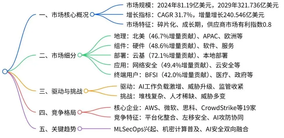 2024-2029 年全球 AI 服务器安全市场呈高速增长态势,2024 年市场规模达 81.19 亿美元,2029 年预计增至 321.736 亿美元,CAGR 达 31.7%,增量增长 240.546 亿美元;市场结构呈碎片化,北美为最大且增长最快区域,硬件、云部署、网络安全、BFSI 行业分别为对应细分领域的最大及高增长板块;驱动因素包括 AI 工作负载激增、AI 特定网络威胁升级及监管收紧,同时面临 AI 堆栈复杂、专业人才稀缺等挑战,市场竞争涉及 AWS、微软、思科等 19 家核心企业,以平台化、左移安全等为关键趋势。