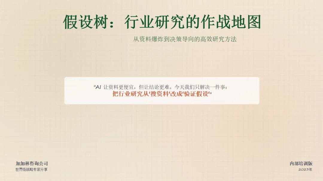 如果你看了第一篇《你写不出好的行业分析报告,多半是方向问题》,就知道这一篇承接第1篇目标卡=方向盘。方向定了,下一步我们就得解决一个更关键的问题:你要验证什么?先验证哪几个?我们做行业研究最怕的不是没资料,而是资料越多,结论越虚。