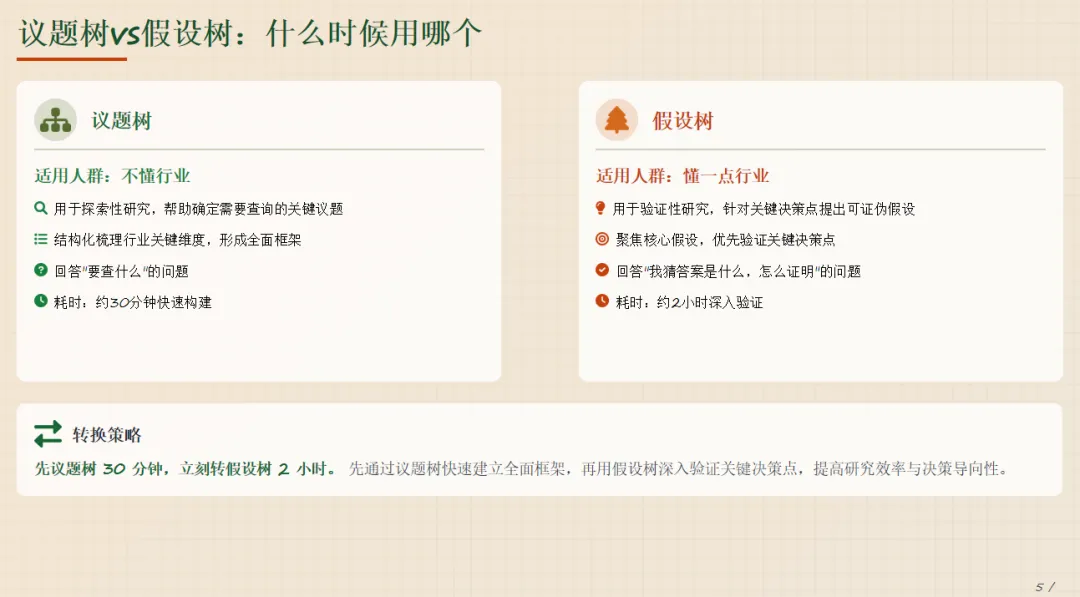 上面提到这两者,那么议题树是什么意思?我还不确定答案是什么→先把要研究的题拆全。就这个意思。假设书呢,我献给一个可能的答案,然后逐条验证。