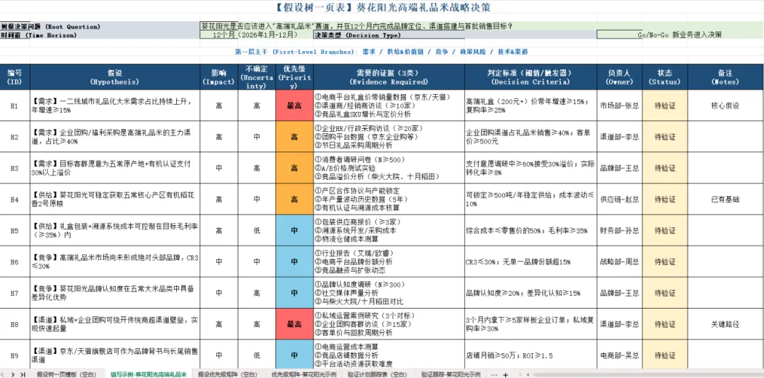 后来做了调整,根问题在于:12个月内,能不能验证:高端礼品米这门生意,值得下注?然后我们锁定了3条致命假设:第一,礼品化需求到底是不是“真趋势”,还是“短期热闹”?第二,供应端能不能稳定提供差异化(否则品牌故事全是空)?三呢,渠道能不能绕开传统大渠道(否则一上来就被压死)?