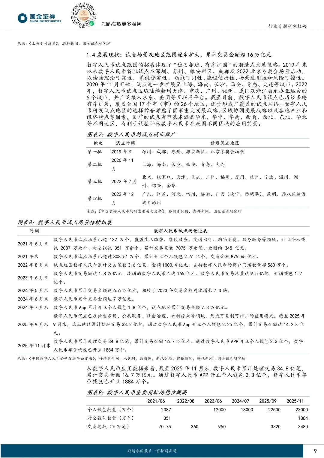 数字人民币采用双层运营体系,央行负责数字人民币的发行、注销等,指定运营机构提供数民币兑换、流通支付等服务,并承担相应的合规和反洗钱责任。经历多年发展,目前已形成 10 家运营机构参与、更多银行及非银行机构响应、17个省市区的 26 个地区试点的状态,截至 2025 年 11 月末,数字人民币累计处理交易 34.8 亿笔,累计交易金额 16.7万亿元。通过数字人民币 APP 开立个人钱包 2.3 亿个,数字人民币单位钱包已开立 1884 万个。