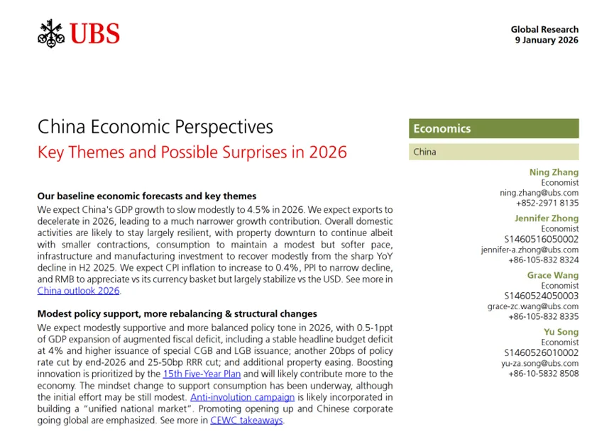 【研报速读】UBS瑞银《中国经济展望2026》要点:在放缓中维持平衡