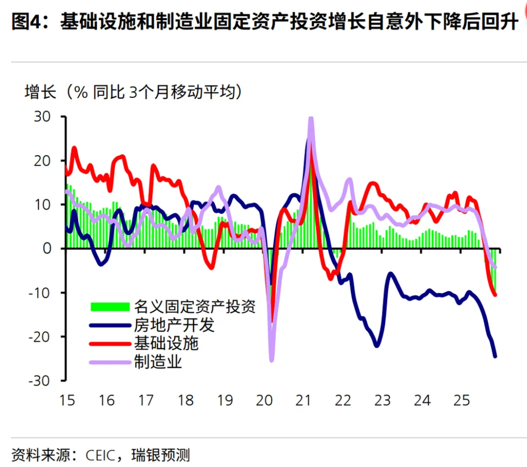 •出口放缓与市场分化:预计总体出口增长将放缓至2.5%-3%。随着中美贸易达成停火协议,对美出口有望在2026年4月后的低基数基础上改善,而对非美市场的出口增长则可能趋于缓和。•消费增长温和:受贸易补贴基数较高、新能源汽车购置税恢复至5%以及房价下跌带来的负财富效应影响,消费增长节奏将有所放缓。尽管如此,新的五年规划将“显著提升消费占GDP比重”作为目标,相关结构性政策将逐步发力。•投资回升:固定资产投资预计在2025年下半年下滑后于2026年实现温和回升。基础设施投资将受益于新五年规划项目的启动和专项债的支持,而与人工智能、信息技术及设备升级相关的投资将保持强劲。04