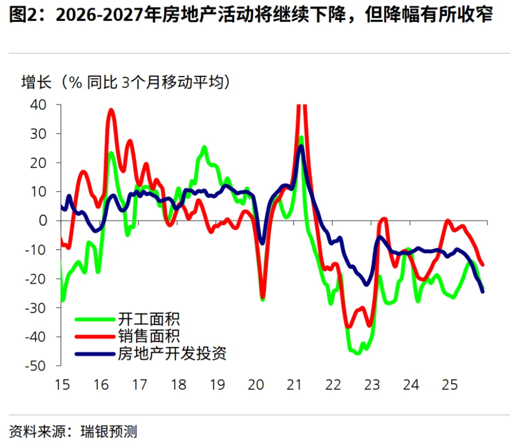 预计2026年房地产销售和投资将下降5%-10%,其对GDP增长的拖累预计将缩窄至0.5-1个百分点。政府可能通过下调按揭利率和推动库存去化来稳定市场。05
