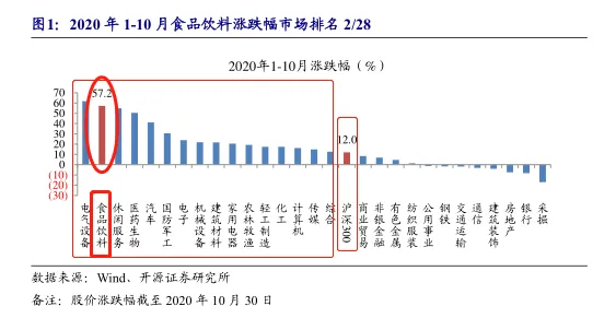 从上图数据可以看到,2020年一月到十月,沪深300涨幅只有12%,而食品饮料行业涨幅有57.2%,跑赢领涨,在一级子行业中排名第二。