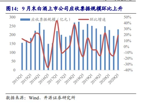 因为疫情影响,渠道资金压力普遍紧张,各大酒厂对经销商票据政策放宽不少,应收票据规模普遍增加。