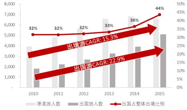 根据国家旅游局发布数据,去除逐步降温的港澳目的地,我国出国游人数占整体出境占比正逐步上升,出国游人数于2010至2015年化复合增长率高达26.6%,见下图: