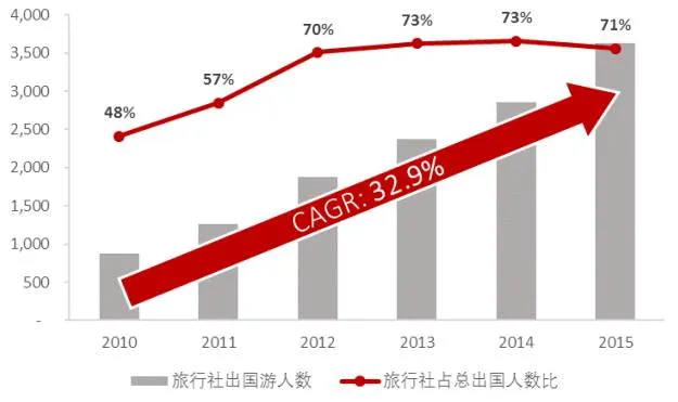跟团游作为发展最早的旅游形态,解决了大多数游客语言不通、环境陌生、海外旅游经验较少等问题,对出境游市场的发展承担着核心支撑作用。据国家旅游局统计,国人通过跟团方式出国旅游占到总出国人数超70%,并且年化增长率高达32.9%,显著高于整体出国旅游的增长