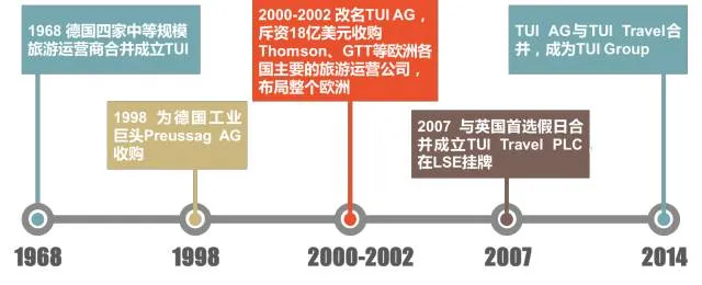 TUI成立于1968年,是世界最大的综合性旅游集团,2016财年销售收入近180亿欧元,公司整体市值近100亿欧元。公司自始便是由德国四家旅行社合并而来,期间借助上市、并购等资本运作坚定推行行业整合战略,进行了一系列的并购重组。途易集团的发展历程见下图: