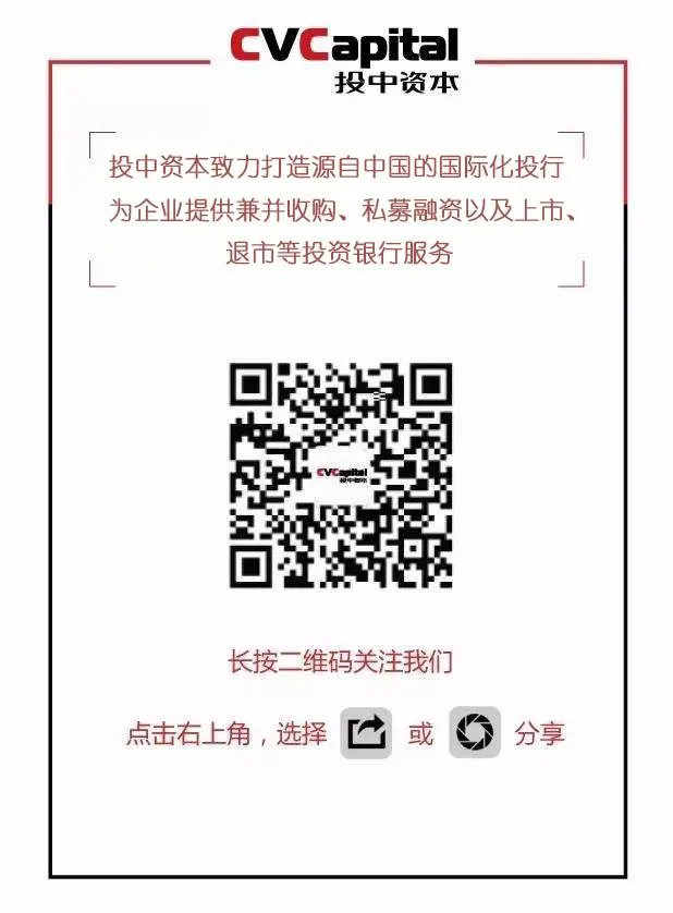 投中资本(CVCapital)致力打造源自中国的国际化投行,在上海、北京、深圳、香港、硅谷、慕尼黑、西雅图设有办公室,重点关注TMT、消费升级、医疗大健康和先进制造领域,为高速成长的各类领域企业提供专业、优质、高效的投资银行服务,包括私募融资、兼并收购以及上市、退市方面的金融顾问服务。目前,投中资本业务已覆盖北美、欧洲、中东、印度、日韩等地,致力于衔接中国资本与全球新经济领域资产,至今已累计完成了逾百亿美金的私募融资与并购交易。登录我们的官网www.cvcapital.com获取更多投中资本相关信息。