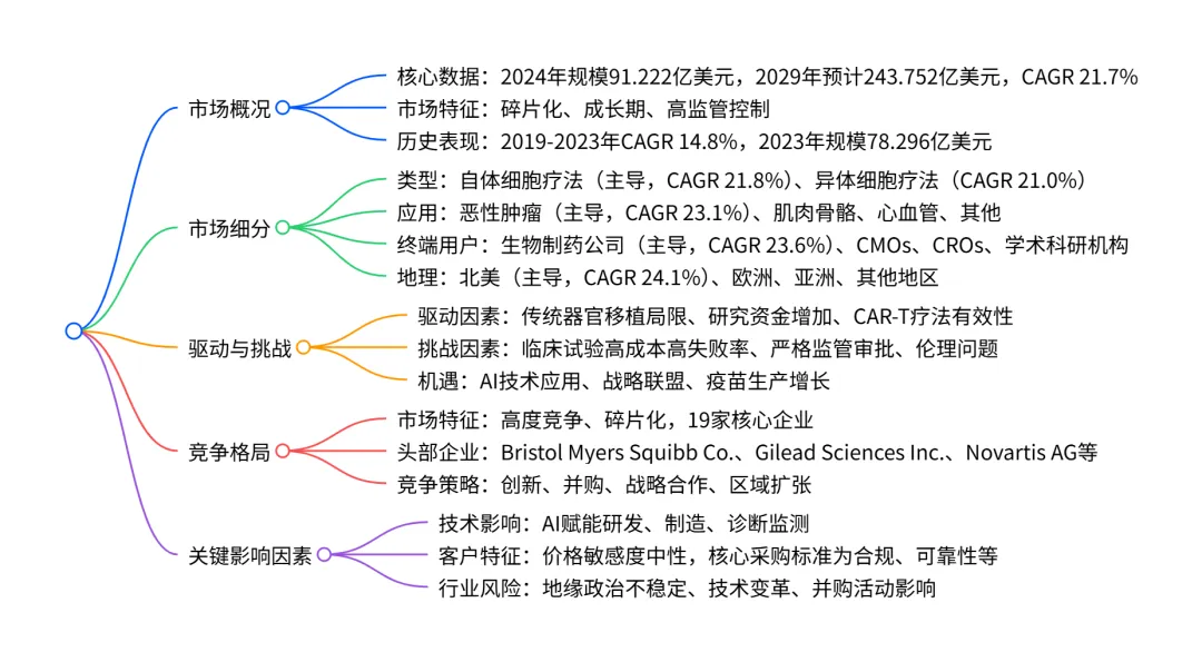 2024-2029 年全球细胞疗法市场呈加速增长态势,2024 年市场规模达 91.222 亿美元,预计 2029 年将增至 243.752 亿美元,CAGR 为 21.7%,增量增长 152.53 亿美元;市场呈碎片化特征,自体细胞疗法(占 2024 年市场份额 86.3%)、恶性肿瘤应用领域(占 2024 年市场份额 54.5%)、生物制药公司终端用户(占 2024 年市场份额 40.6%)及北美地区(占 2024 年市场份额 40.1%)分别为各细分领域的主导者且增长最快;推动市场增长的核心因素包括传统器官移植的局限性、细胞疗法研究资金增加及 CAR-T 细胞疗法的经证实有效性,同时面临临床试验高成本高失败率、严格的监管审批及干细胞研究伦理问题等挑战,人工智能技术在药物研发、个性化治疗等方面的应用为市场带来新机遇。