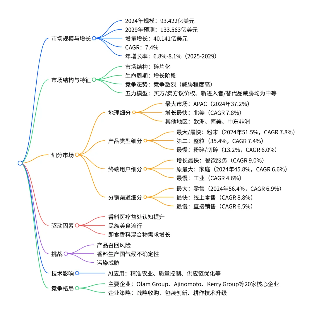 2024-2029 年全球香料市场呈加速增长态势,2024 年市场规模达 93.422 亿美元,2029 年预计增至 133.563 亿美元,CAGR 为 7.4%,增量增长 40.141 亿美元;市场呈碎片化结构,竞争激烈,APAC 是最大市场(2024 年占比 37.2%),北美为增长最快地区(CAGR 7.8%);产品类型中粉末状香料占比最高且增长最快(CAGR 7.8%),终端用户以餐饮服务增长最显著(CAGR 9.0%),分销渠道中线上零售增速领先(CAGR 8.8%);驱动因素包括香料医疗价值认知提升、民族美食流行等,同时面临产品召回、气候不确定性等挑战,AI 技术正推动行业效率与质量升级。