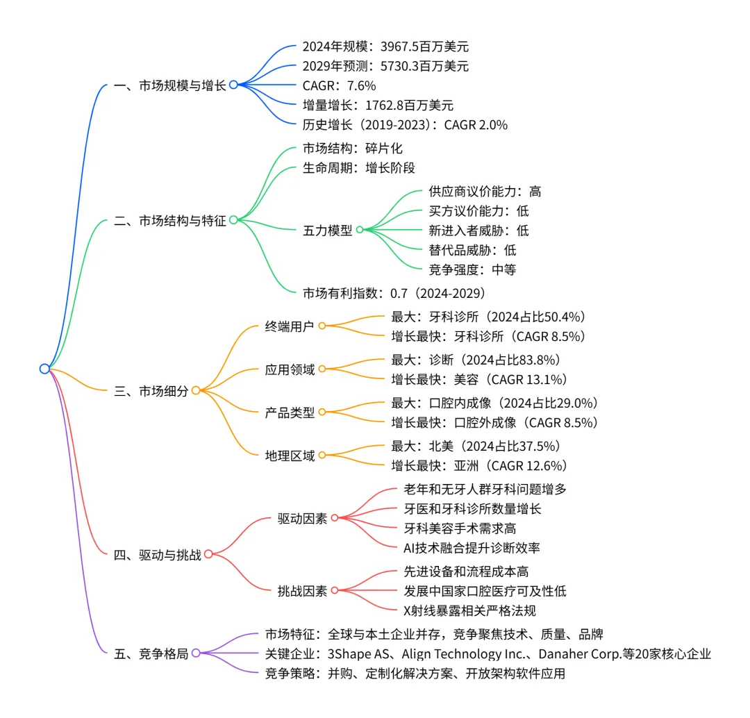 2024-2029 年全球牙科影像市场呈加速增长态势,2024 年市场规模达 396750 万美元,2029 年预计增至 573030 万美元,CAGR 为 7.6%,增量增长 176280 万美元;市场呈碎片化结构,供应商议价能力高、买方议价能力低,新进入者和替代品威胁均较低;牙科诊所是最大且增长最快的终端用户 segment,诊断是核心应用领域,口腔内成像为主要产品类型,亚洲是增长最快的地区(CAGR 12.6%),AI 技术融合、牙科疾病发病率上升等为主要驱动因素,而设备高成本等是核心挑战,市场竞争集中于技术创新、质量和品牌层面。