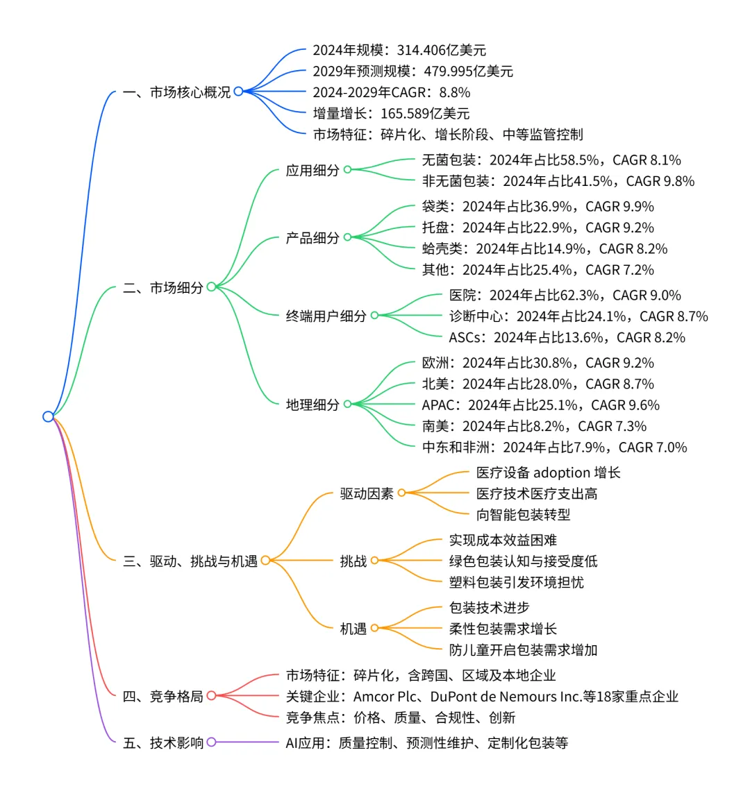 全球医疗设备包装市场 2024 年规模达314.406 亿美元,2029 年预计增至479.995 亿美元,2024-2029 年 CAGR 为8.8% ,增量增长165.589 亿美元;市场呈碎片化特征,竞争激烈,欧洲是最大区域市场,APAC增长最快,无菌包装为最大应用细分,非无菌包装增速领先,袋类是最主要产品类型,医院为核心终端用户;驱动因素包括医疗设备 adoption 增长、医疗技术医疗支出增加及智能包装转型,同时面临成本效益、绿色包装认知不足等挑战,AI 技术在质量控制等领域的应用及技术创新为市场带来新机遇。