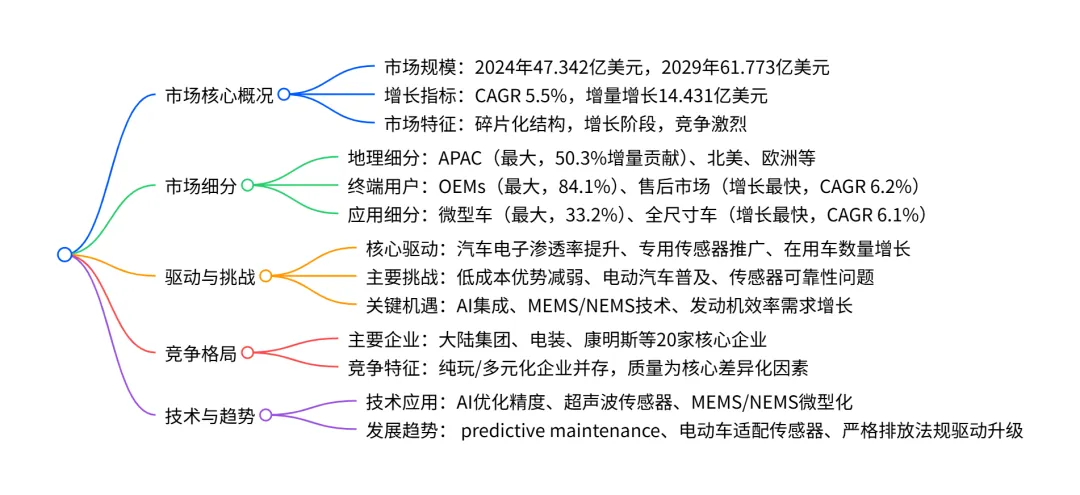 2024-2029 年全球汽车发动机油位传感器市场呈加速增长态势,2024 年市场规模达47.342 亿美元,预计 2029 年增至61.773 亿美元,CAGR 为5.5%,增量增长14.431 亿美元;市场呈碎片化结构,APAC是最大且贡献 50.3% 增量增长的区域,OEMs为最大终端用户 segment(2024 年占比 84.1%),全尺寸车和售后市场是增长最快的应用与终端用户 segment;核心驱动因素包括汽车电子渗透率提升、柴油 / 生物柴油车辆专用超声波传感器推广及在用车数量增长,主要挑战有低成本制造国优势减弱、电动汽车普及及传感器可靠性问题,AI 集成和MEMS/NEMS 技术应用为关键发展机遇,市场竞争激烈且新进入者威胁中等。