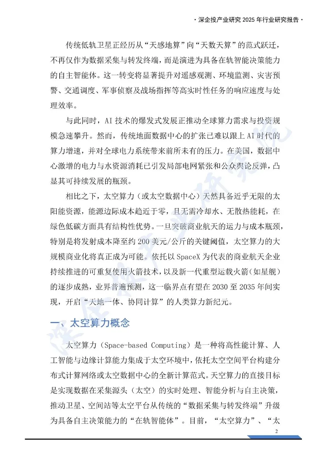 本篇分享的内容是《2026行业研究系列太空算力发展研究报告:商业航天时代来临,开启下一代计算范式的苍穹革命》📈 传统低轨卫星正经历从“天感地算”向“天数天算”的范式跃迁,不再仅作为数据采集与转发终端,而是演进为具备在轨智能决策能力的自主智能体。这一转变将显著提升对遥感观测、环境监测、灾害预警、交通调度、军事侦察及战场指挥等高实时性任务的响应速度与处理效率。