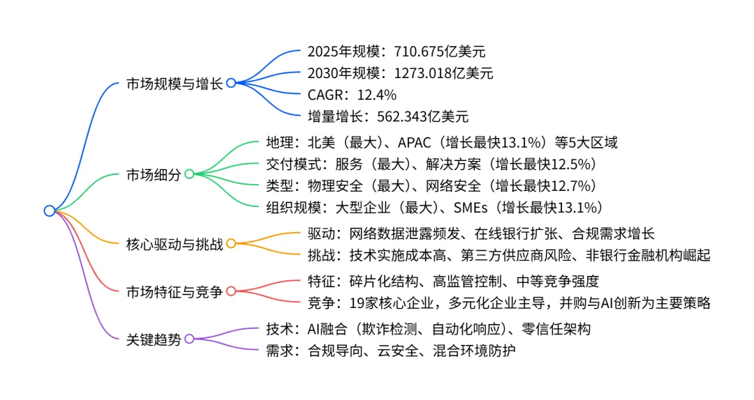 2025-2030 年全球 BFSI 安全市场呈加速增长态势,2025 年市场规模 710.675 亿美元,2030 年将达 1273.018 亿美元,CAGR 为 12.4%,增量增长 562.343 亿美元;市场结构呈碎片化,北美为最大区域市场(2030 年占比 56.3%),服务类为最大交付模式 segment(2025 年占比 53.5%),物理安全为最大类型 segment(2025 年占比 56.1%),大型企业为最大组织规模 segment(2025 年占比 67.3%);网络安全、SMEs、APAC 地区为增长最快细分领域,AI 技术融合、合规需求升级为核心驱动力,同时面临技术实施成本高、第三方供应商风险等挑战,市场竞争以多元化企业为主导,并购与技术创新为主要竞争策略。
